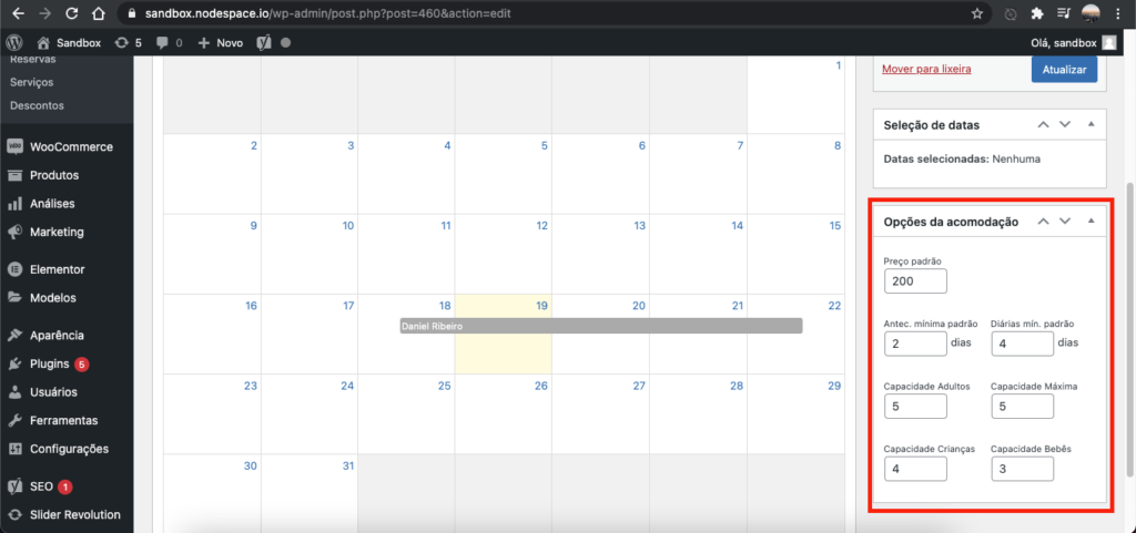 3 – No quadro destacado na imagem abaixo, estão as configurações padrões da acomodação. Datas que não tem configurações específicas consideram estes parâmetros.