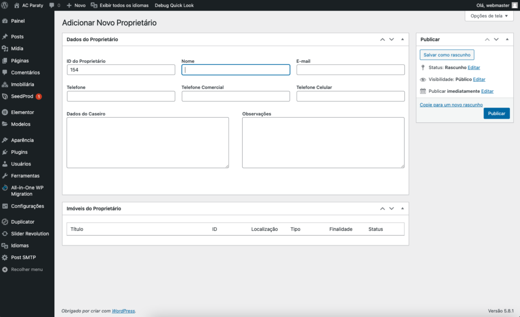 5 – Clique no botão Atualizar em caso de edição ou Publicar em caso de novo proprietário. Uma vez publicado, poderá ser vinculado a imóveis através dos passos exibidos em Gerenciando Imóveis